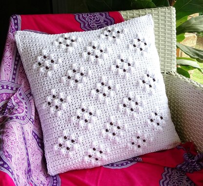 The beaded puff stitch pattern design is featured on the front. The back of the cushion is plain and closes with 3 natural wooden buttons.