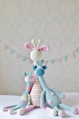 This cute Giraffe is my own design, when finished measure's 15" tall including the legs (when using DK yarn and size 3.5 hook) He will be approx. 24" if you use a chunky yarn with 3.5 hook.