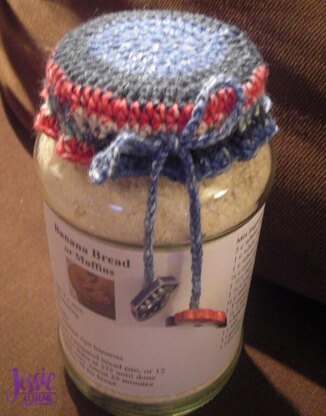 Crochet jar tops are great for topping off your jar gifts for any occasion. This free crochet pattern/tutorial will walk you through making the finished gift jar top as seen below. You can vary it in many ways for many occasions and for any size jar top. I’ll talk about some variations at the end.