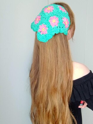This crochet pattern is very easy to follow, and creates the most beautiful bandana/headscarf with a lovely feminine vibe. This is a super fun project which can be made up in the space of a week-end. It has a lovely Boho vibe to it. This bandana is easy to crochet and features a unique flower granny square design and shell stitch edging. For this project you will need Drops Muskat yarn in 3 different colors; this is a 100% mercerized cotton yarn in a DK/light 3 weight. You will also need a 4 mm crochet hook, a tapestry needle, and a pair of scissors.