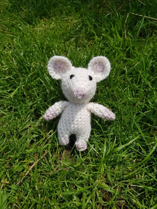 The crochet mouse is 12cm in height to fit perfectly into a pocket on a child's item of clothing. It is created mostly in rounds with a 3.5mm hook and uses DC, increase and decrease stitches. It's a simple design perfect for a beginner moving into small amigurumi.