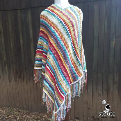 Crochet poncho pattern is great for trying out a mixure of easy crochet stitches, pattern is easy to follow, and with the varity of crochet stitches the final cozy poncho is very quick to make. Inspired by the bold and bright colors of bohemian stripes and textures, between rows bring strong accents to shabby chic styles. Finished poncho is light
