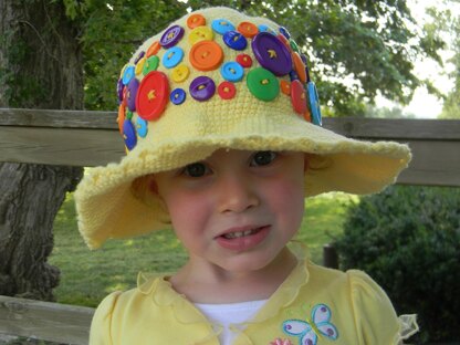 Skill level: beginner Finished dimensions: sized for 3-10 year old girls (head circumference about 21 inches) Yarn: 100% worsted cotton yarn (such as Lily's Sugar and Cream). 7oz Hook: 4mm crochet hook US G, or size needed to obtain gauge. Other materials: stitch markers, buttons in different colors and sizes (such as Favorite Findings Big bag of buttons) Gauge: 11 sc and 11 rows = 2"