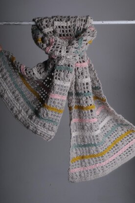 This is an elegant, long and lightweight scarf. It is made it using Plump DK for the background colour which works well with the soft bobbles. This is contrasted with Swaddle for the stripes which give a more defined texture and zing of colour.
