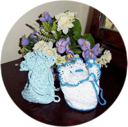 Approximate finished measurement: The bag stands about 12.5 cm/5-inches high (10 cm/4-inches to drawstring) NOTE: A bag made with size 10 crochet cotton will be slightly larger over all than one made with size 12 crochet cotton.