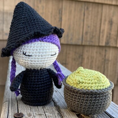 This pattern is for a cute little witch and her cauldron. I suggest Scheepjes Catona yarn, a B crochet hook, and tight stitches to achieve a cute 4.5in/11.4cm doll or Halloween table top decor. The fun thing about this project is that you can easily change the size by simply changing the weight of your yarn and the size of your crochet hook! This project contains no small parts so it is suitable for all ages. The difficulty level is advanced beginner to intermediate.