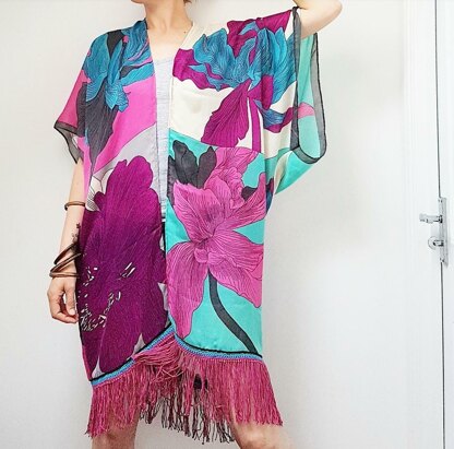 This pdf pattern gives you full instructions to upcycle a scarf into a kimono style cover up, with crochet edging and fringing. This mix of upcycling with crochet is called #crochethacking. This elegant kimono style cover up was made for my sister to take on holiday but I’m so in love with it I’m going to make one for me as summer dressing gown! I love the sweeping tassels and crochet detail, but you could make them any length you like or even leave them of altogether. #Crochethacking is not a precise art so think of this as a set of guidelines rather than a traditional pattern. The idea is to give you the tools to experiment and play with your own clothes, keeping them out of landfill and making them things that are unique tailored just to your taste.