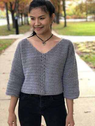 It's a loose fitting crop top/ sweater but it can be adjusted to fit more snug and can be made full length, or longer if you like. It has a fun little v puff stitch detail on the front that I love.
