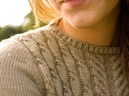 Sweater knit with yarn held double on body, as a dk weight, and singly on sleeves, as 4ply. cable panels are charted and written out in full.