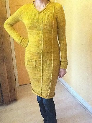 This top-down dress with interesting geometric line play is a delight to wear. The easy construction, made with Suzie M.'s contiguous method, is quickly knit up. The purl stitch decorative lines and purl I-cord trim, as well as little pocket make it interesting and fun. Length for body and sleeves can be adjusted to your own preference. Use the fabulous Madelinetosh yarn or any worsted yarn you like against your skin...