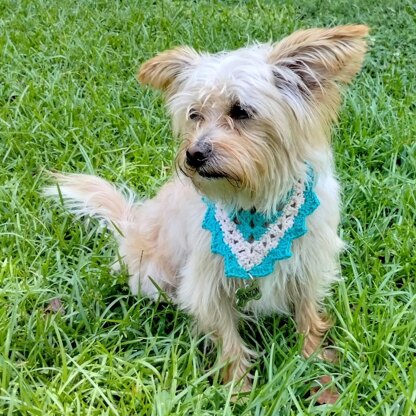 The Crosshell Granny Pet Bandana is an easy granny stitch repeat pattern with a whimsical crossed dc, dc cluster and shell border.