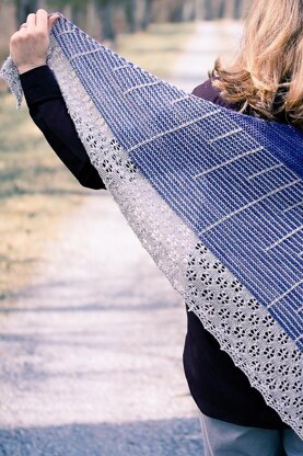 Like melting icicles, columns of slipped stitches drip down from the top of this two-color triangular shawl. Some are frozen midway, while others merge with the edging, pooling into the delicate snowflake border.