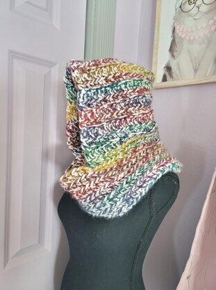 This easy crochet pattern requires 180 yards of size [6] super bulky yarn to make an adult-sized hooded cowl. (The cowl is 28" around and 5.5" tall. The hood is 20" across and 9" tall.) The featured yarn is Yarn Bee Colorplay in colorway Weekender. You'll also need a US-N 9.00mm crochet hook, a large-eyed tapestry needle to weave in ends, and a scissors.