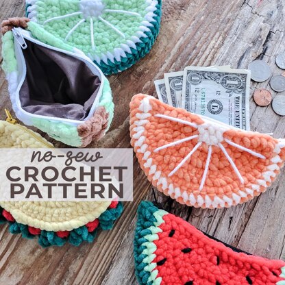 The Cuddly Coin Purse is a fun, beginner-friendly project designed for plush chenille yarn. With 1 base pattern, there are 5 variations provided in the pattern, including rainbow, taco, watermelon, kiwi and lime (and other citrus). Upon completion, the finished coin purse will be approximately 3x4 inches in size (size may vary based on yarn and hook size used).