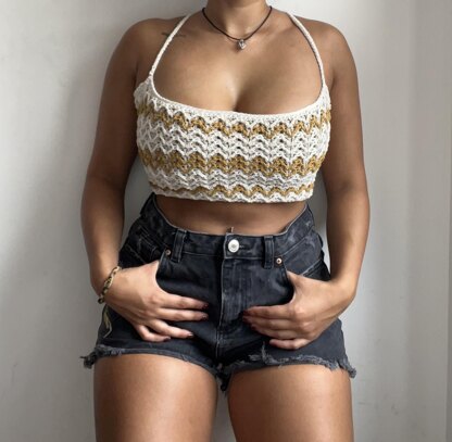 Introducing the exquisite "Cuevas" halter crochet pattern. Designed with care and attention to detail, this bralette features a laced up back elegantly woven through eyelets. The halter design will frame the shoulders gracefully offering a chic and confident image. The combination of this alluring silhouette and the captivating texture of the arrow stitch, creates a fashion-forward piece that seamlessly blends comfort and style.
