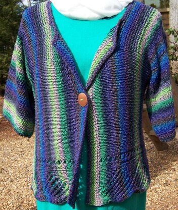 The name says it all … designed to show the color-striping (and the wearer’s shape) to best advantage: with self-scalloped border … single button closure … 3/4 sleeves with minimal finishing in a colorway with “pops” of color … cunning, indeed!
