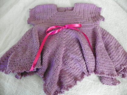 Baby dress, worked in 4 ply, with a 3mm hook. Button fastening on the back. Ribbon on the waist.