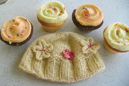 This baby hat design was originally called “Fleur,” because of the flowers I planned to add to the sides. But when it was fin- ished, it was unmistakably a cupcake in knitted form, deco- rated with “frosting” flowers and a swirl on top. The cap is knit top-down, so you can make it as long as you like; use the measurements here as a guide.