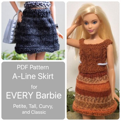 This pattern includes instructions for all of Barbies New and existing Body sizes: Petite, Tall, Classic, and Curvy. It is a knit in the round pattern with written instructions, no charts. The finished skirt pulls on easily from the legs up. I also sell knitting kits, and pattern bundles in my etsy store: www.etsy.com/shop/mettacreative