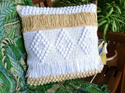 Original design handmade boho inspired square crochet boho cushion cover featuring diamond shaped puff stitch pattern design and tassels. The textured design is featured on the front of the cushion cover. The back of the cushion cover is plain and closes with 3 natural wooden buttons. I have finished this cushion cover in a 10 ply eco cotton yarn so it durable and easy to wash. Custom colours are available on request. This cushion cover can also be made to a smaller or larger size. Contact me to discuss your requirements.