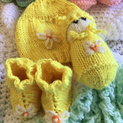 Cute Baby set for the new baby. lncludes a hat, bootees and toy. Quick to knit and works well with paintbox 1 ball 50gm dk yarns. Knitted flat and suits beginners.