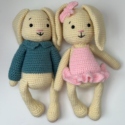 Create your own adorable crochet bunny duo with this easy-to-follow digital PDF pattern – perfect for gifting, keepsakes, nursery decor, or playtime pals. This listing includes instructions for a crochet bunny, plus two outfit variations: one for a boy and one for a girl.