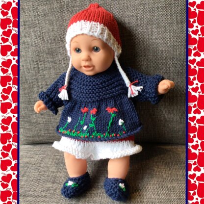 Cute dolls clothes pattern knitted flat in DK yarn with embroidery on the dolls smock and shoes. Daisy loves her outfit and is looking forward to wearing it on Christmas day. I have knitted it in 8ply cotton, it works well with Paintbox yarns.