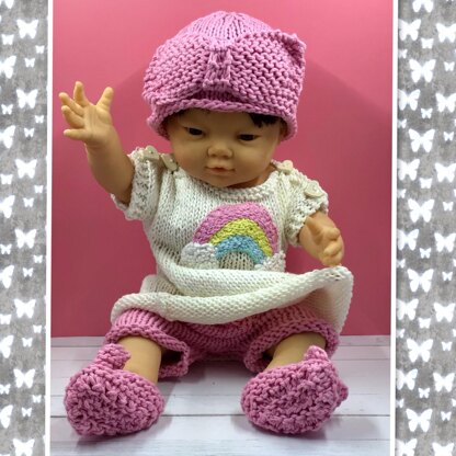 Rainbow Susie loves wearing her rainbow outfit, it makes her smile and feel happy. The pattern is knitted flat and includes dress, knickers,shoes and hat with easy instructions for the rainbow embroidery. Knitted in pink and white 8 ply cotton. Works well with Paintbox yarns.