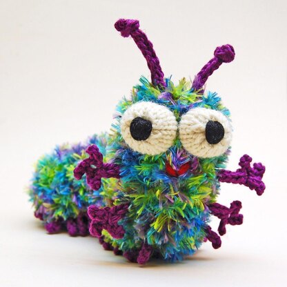 The example was made with novelty eyelash yarn and various worsted weight (8 or 10 ply) wool yarns using US size 3/3.25mm needles, but almost any yarn could be used with the corresponding needle size. Cuterpillar measures approximately 7 inches long & 5 inches tall (including antennae). But of course size will change depending on choice of yarn & needle.