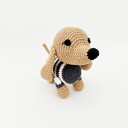 The dog measures approximately 21 cm from nose to tail and 15 cm tall when using the materials mentioned above. If you are using yarn with a different gauge the toy’s measurements will change.