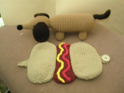 Materials:•yarn - dark brown for ears and tail •yarn- tan for bun •yarn- black for nose •yarn- burgendy for hot dog •yarn- red for ketchup •yarn - yellow for mustard •yarn - light brown for head, body & legs