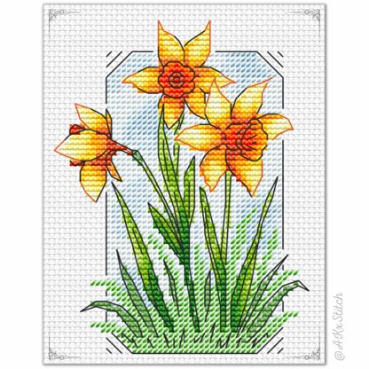 Cute Yellow Daffodils Cross Stitch. The design features bright welsh flowers with a frame. Fun and easy to follow pattern with stunning results. Great handmade gift idea for a family or friend or spring greeting card.\n\nSize: 49w x 64h stitches\nStitched size: approx 9 x 12 cm (4 x 5 in)\nDMC Threads: 16 solid colours (1 blend)\nUsed stitches: full cross stitch, half cross-stitch, backstitch\nSkill level: Easy / Beginner\nStitch time: 13-20h\n\nCross stitch pattern in PDF, Instant Digital Download includes: 1) cover page with preview; 2) instructions, symbols key and shopping list (DMC thread colour numbers and estimates, as well as fabric options); 3) two black and white charts, with and without backstitch; 4) two colour charts, with and without backstitch; 5) single page PDF for Pattern Keeper (available on request).\n\nPlease note: This pattern is for personal use only - not for commercial use. You can't make copies of our charts to distribute (either as PDF or printed versions) but you can definitely sell your finished cross stitch work.