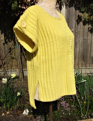 A lovely easy-fit top with split level side slits edged in garter stitch. The pretty cable panel sits against a background pattern of wide twisted rib. Stylish deep armholes are finished with the sleeve borders buttoning with a large button at the shoulder.