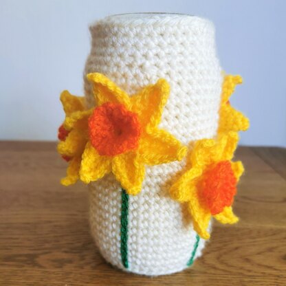 This pattern is designed to cover any size jar you have, turning it in to a beautiful daffodil vase, pen holder, pot or container. It is a beginner/intermediate pattern (as it has a few fiddly bits) and is written in American Standard crochet terms.