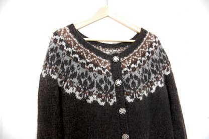 This is a pattern for a cardigan with a circular yoke. It is worked from the bottom up and in the round with a steek. There are notes about sizing for women and men.
