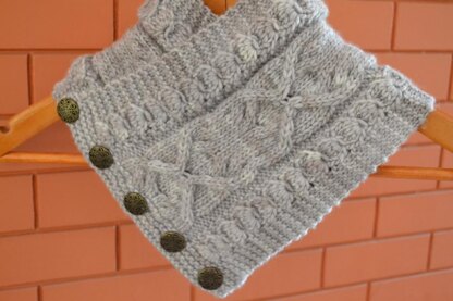 A simple yet stylish, buttoned neck warmer with a cabled center panel, bordered with daisy and garter stitches.