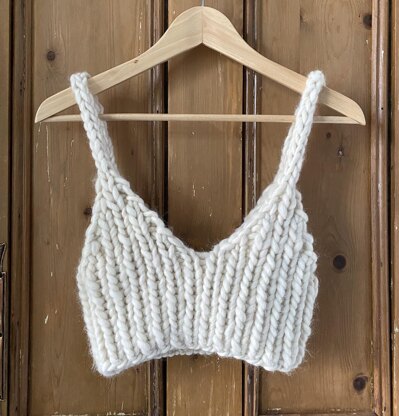 A super chunky ribbed cropped bra top knitted in one piece in the round in 1x1 rib. I-cord shoulder straps are knitted from the top of the body and cast off with the back stitches. It only needs one ball of super chunky yarn and is quick to knit up in an afternoon or evening. One size - fits upto a 36" chest.