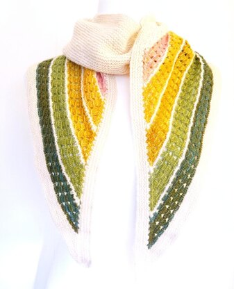 The Daisy Dance shawl has an elongated crescent shape and combines color play with intriguing textures. A garter stitch border frames the shawl, while colorful bands of eyelets swoop across it. This shawl is an ideal showcase for a gradient set, but also looks great with two contrasting colors.