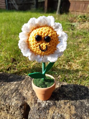This is a PDF downloaded pattern for a Crochet daisy style flower, when completed it will look lovely standing in its pot and is a perfect gift as zero maintenance is required to keep it looking fresh.