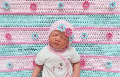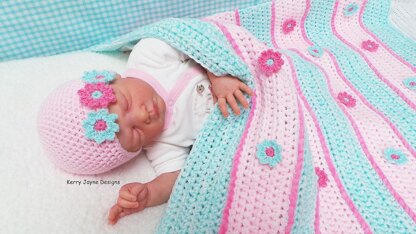 A beautiful striped blanket and hat pattern adorned with cute daisies.