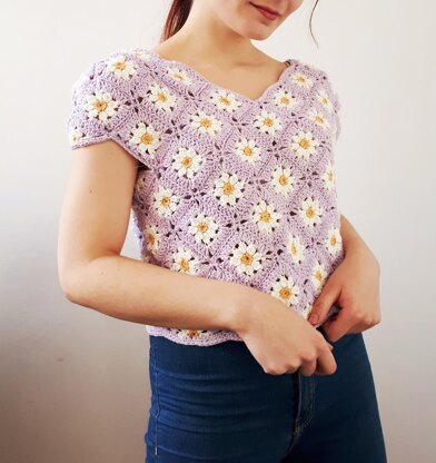 Size M -Use: 4 mm hook, Sport weight for flower, worsted yarn for the border, Size of the top: 94 cm/ 37 in