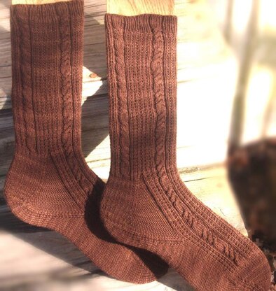 This sock pattern was designed for my Dad who wanted a warm pair of socks to wear when he went hunting. This basic boot sock pattern uses a simple garter rib for that “thermal” look and undulating rope cables to symbolize the hunting trek itself. Directions for simple arch shaping and a fitted heel are also provided.