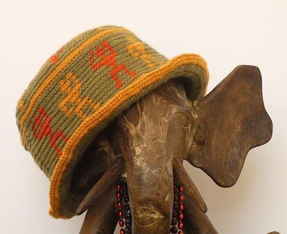 Tapestry crochet dancing figures make their way around the crown and sides, forming a vibrant design.