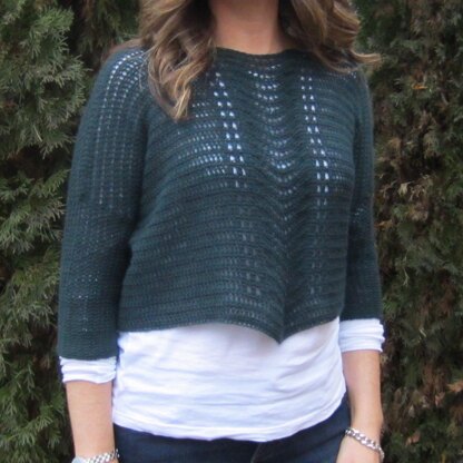 Dani is a short, boxy sweater with front and back lacy panels and 3/4 sleeves. You begin by crocheting the two, identical body pieces. Then, seam by crocheting them together. Add sleeves to the body, worked in the round. And, presto--a light an lacy, yet warm sweater to dress up your wardrobe!