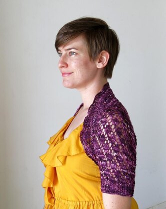 Worked from the center out, the Dark Lotus Shrug is a delicate cover-up featuring an intricate flower medallion. The body and sleeves are finished with a lace rib. A special bind off on the body makes a delicate ruffle and provides a very stretchy opening. Stitch patterns are charted. Choose a size that is 2-3” bigger than your shoulder width.