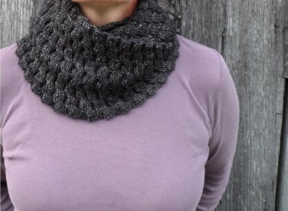 A truly reversible textured cowl - the two sides are identical. Stretchy enough to go over your head twice and still be snug enough to keep out the cold wind. Sample shown was knit in luscious Astral Bath Tesseract DK.