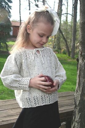 The apple of your eye takes on Victorian charm in this comfortable little pullover with ribbed lace "smocking" at bodice, cuffs, and hem. A bow at the neck completes the look.