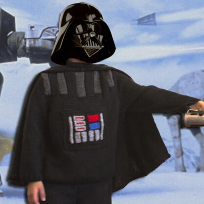 With a godson who loves nothing better than dressing up as his favourite movie and cartoon villains, it was only a matter of time before I ended up making something like this! He is a great fan of Star Wars, so who better than the iconic bad guy Darth Vader to inspire his new costume? This knitting pattern includes instructions for the sweater and the cape. The buttons panel on the front is a pocket with 2 side openings.