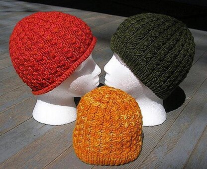 A unisex cable patterned hat in three sizes (Child's, Adult Small, and Adult Large) with two alternate brim treatments.
