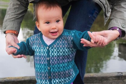 Mosaic stitch patterning on the fronts gives this V-neck jacket a retro flair, underlined by the restrained texture on the back. If you can’t resist the look of little boys in grandpa cardigans, this one’s for you.
